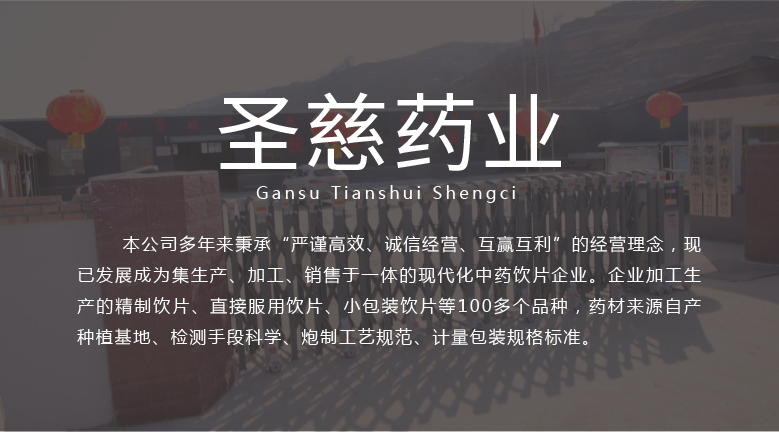 甘肅天水圣慈藥業(yè)有限公司成立于2016年11月8日,注冊資本500萬元,位于甘肅省天水市張川回族自治縣張川鎮(zhèn)中城南路,本公司多年秉承“嚴(yán)謹(jǐn)高效、誠信經(jīng)營、互贏互利”的經(jīng)營理念,現(xiàn)已發(fā)展成為集生產(chǎn)、加工、銷售于一體的現(xiàn)代化中藥飲片企業(yè)。企業(yè)加工生產(chǎn)的精制飲片、直接服用飲片、小包裝飲片等100多個品種,藥材來源自產(chǎn)種植基地、檢測手段科學(xué)、炮制工藝規(guī)范、計(jì)量包裝規(guī)格標(biāo)準(zhǔn)。